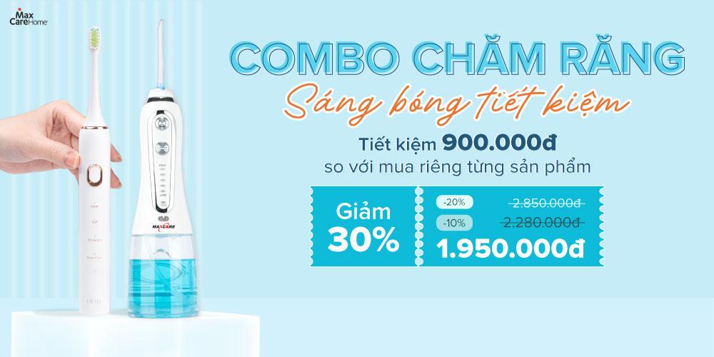 Mua theo combo - Deal chồng deal: Sale 20% khi mua riêng lẻ Bàn chải điện Maxcare Hera SE hoặc Máy tăm nước Max456SE, sale thêm 10% khi mua combo. Vừa chăm răng chuẩn nha khoa, lại vừa tiết kiệm ngay 900K.