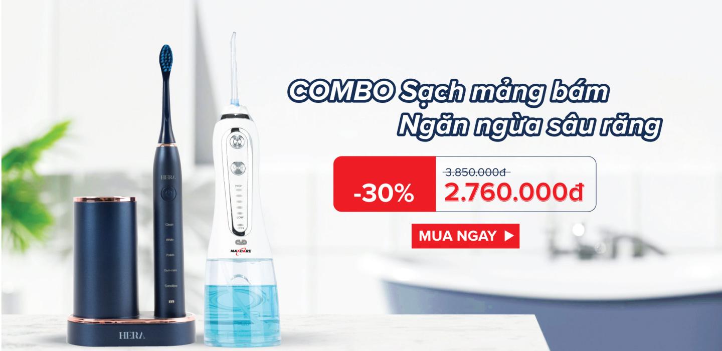 Mua theo combo - Deal chồng deal: Sale 20% khi mua riêng lẻ Bàn chải điện Maxcare Hera hoặc Máy tăm nước Max456SE, sale thêm 10% khi mua combo. Vừa chăm răng chuẩn nha khoa, lại vừa tiết kiệm ngay 1.090K.