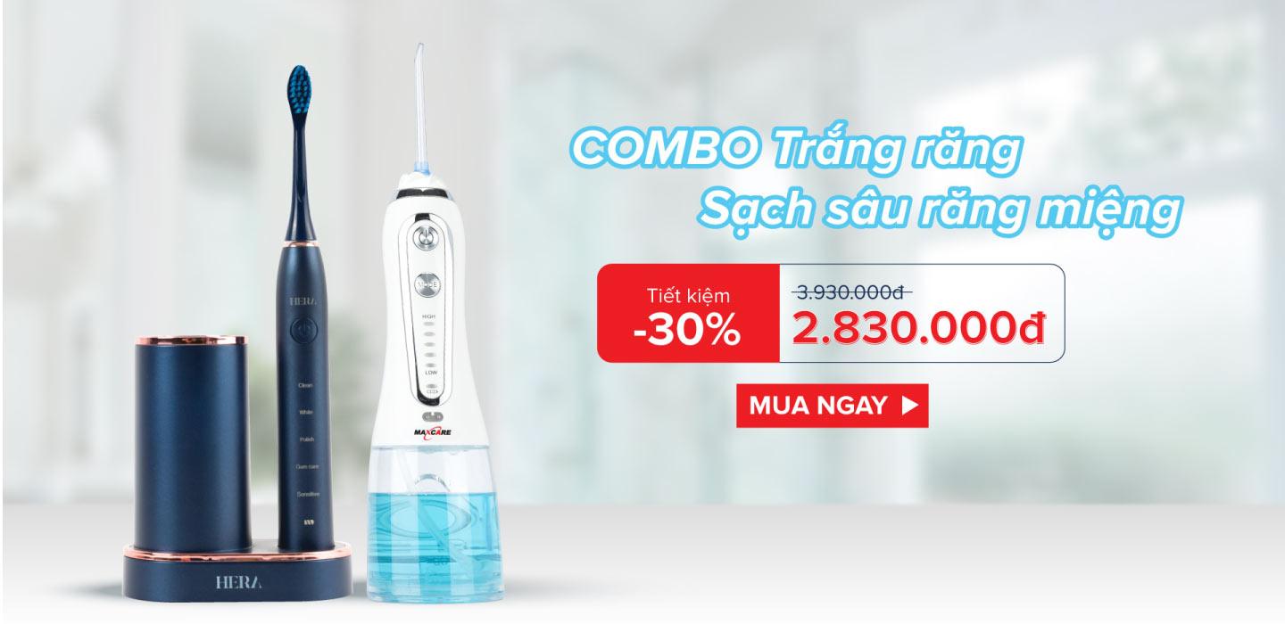 Mua theo combo - Deal chồng deal: Sale 20% khi mua riêng lẻ Bàn chải điện Maxcare Hera hoặc Máy tăm nước Max456S, sale thêm 10% khi mua combo. Vừa chăm răng chuẩn nha khoa, lại vừa tiết kiệm ngay 1.100K.