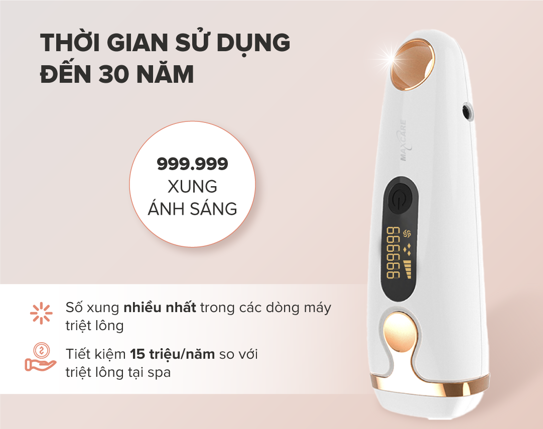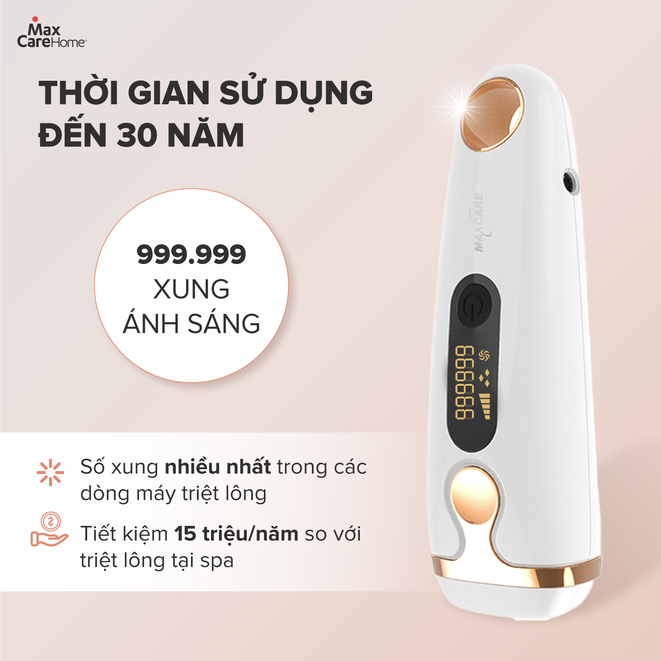 Máy triệt lông cá nhân IPL Maxcare Venus M1 là một trong những thiết bị triệt lông có số xung triệt lớn nhất hiện nay - 999.999 xung ánh sáng, có thể sử dụng lên đến 30 năm. Thiết bị sẽ dừng hoạt động khi sử dụng hết số xung trong máy.